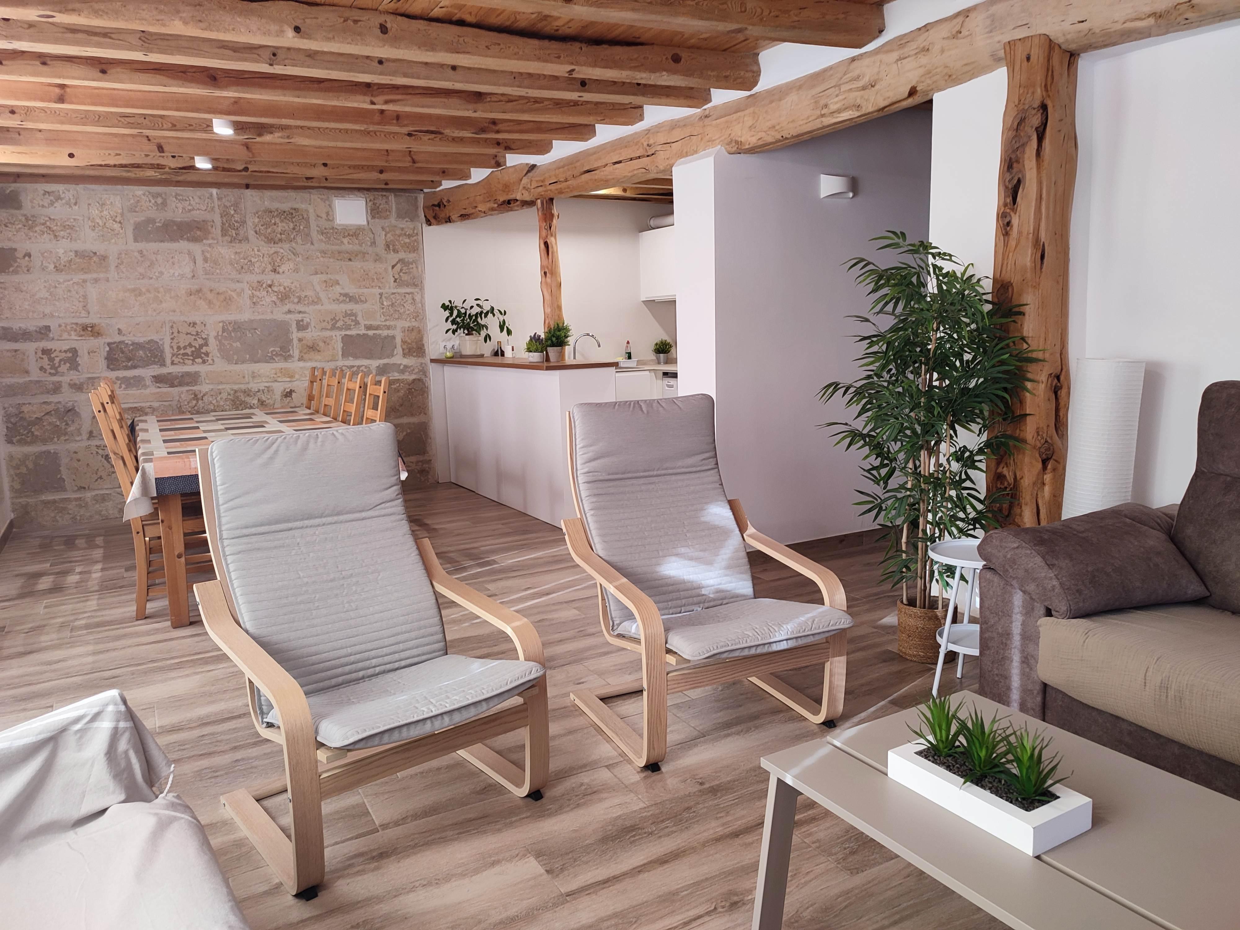 La vivienda consta de dos plantas con entradas independientes desde un patio con porche. Ambas plantas presentan una estructura similar, con cocina abierta al salón-comedor, dos cuartos de baño y tres habitaciones, dos de ellas dormitorios.